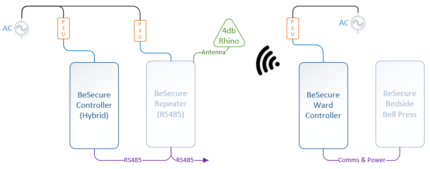 The Ward Controller (BHI1003-050-01) will communicate with the BeSecure Repeaters via the BeSecure 868Mhz Wireless network.