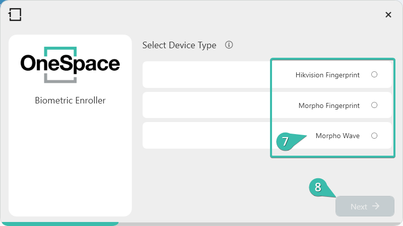 7. The OneSpace Enroller App will now open. Select the type of device you are using for your site. In this guide we are using Morpho Wave Biometric Terminals.